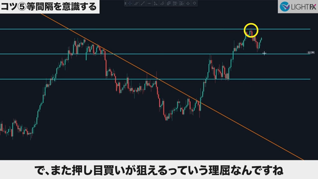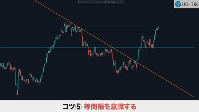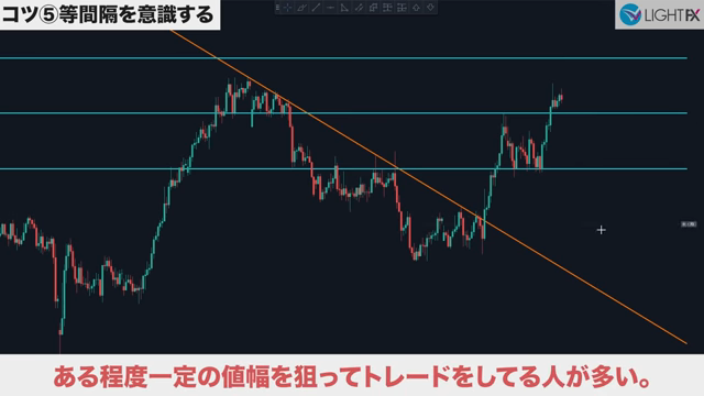 近い等間隔の幅を探すと、より精度が高まる。同じ時間足でトレードする人は、一定の値幅を狙っているから。