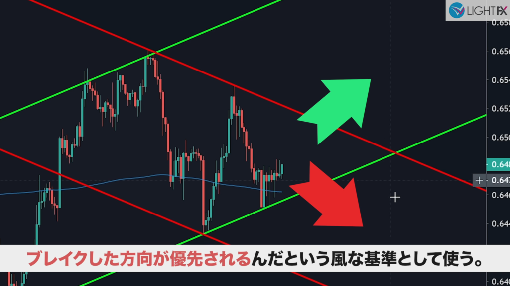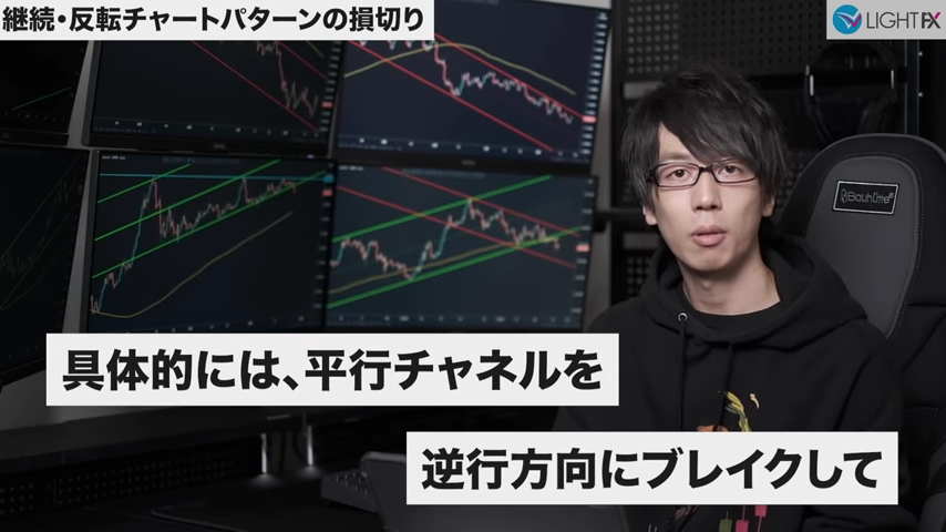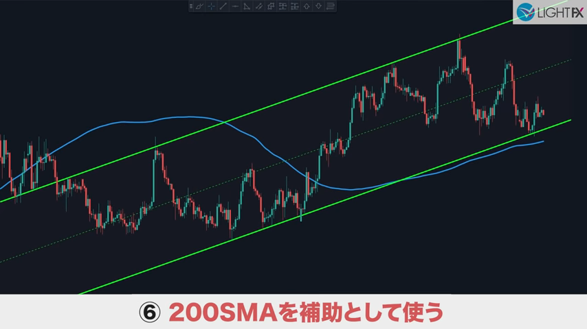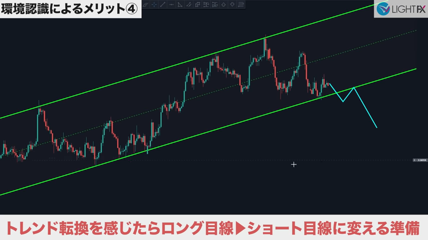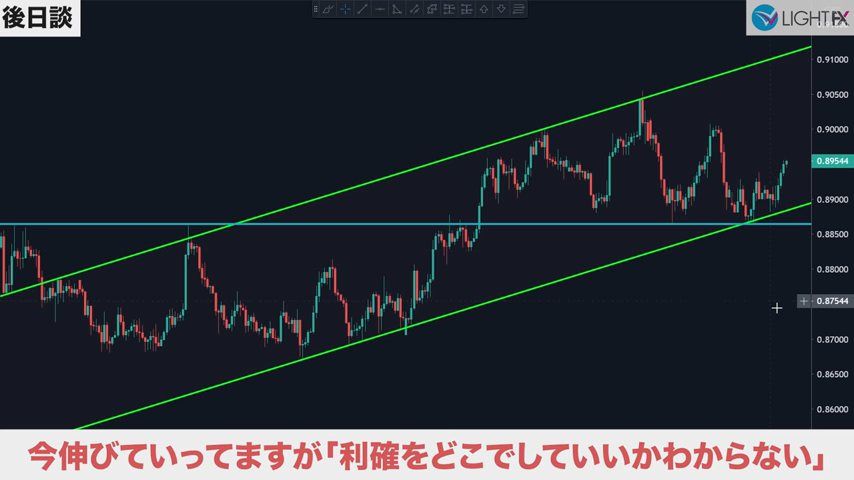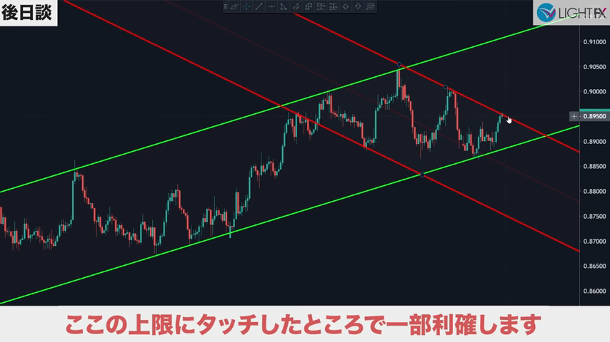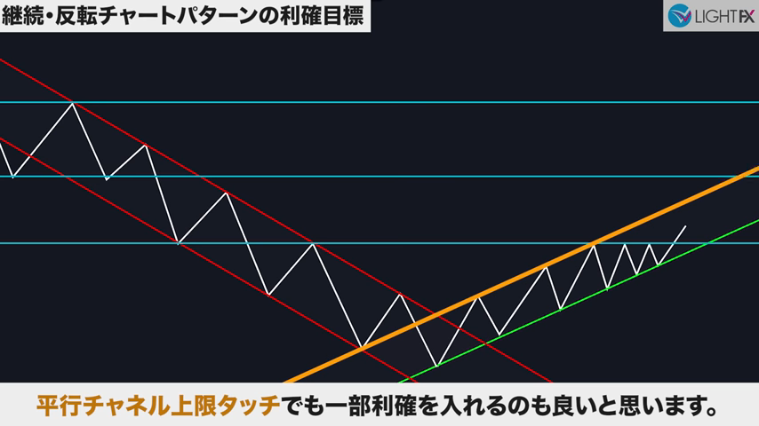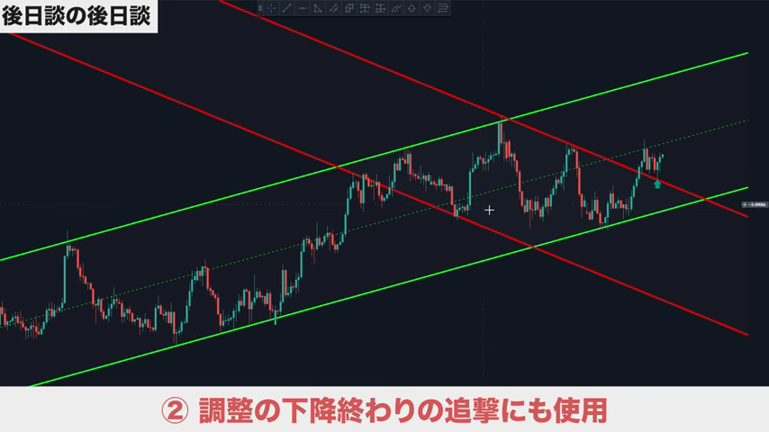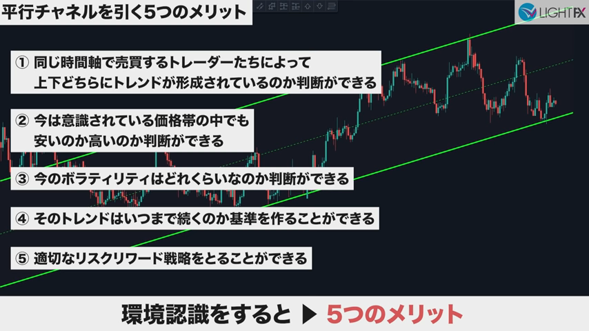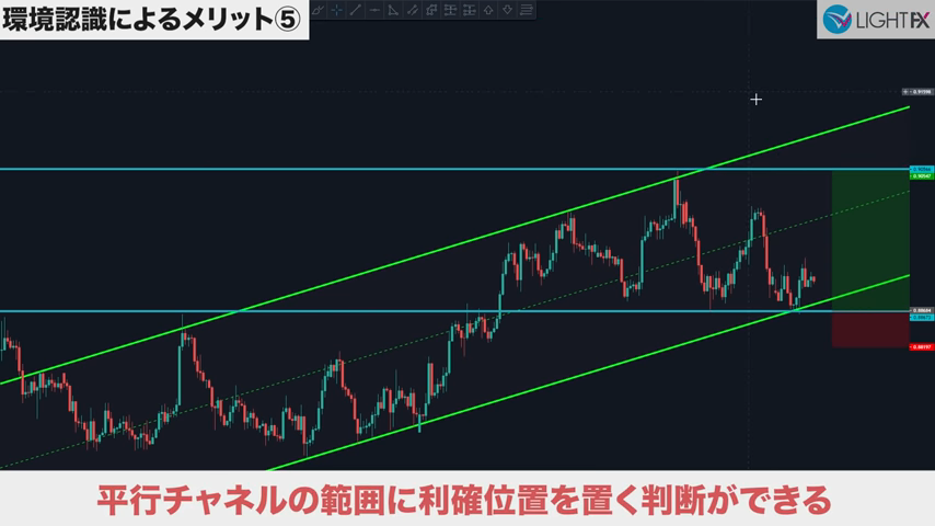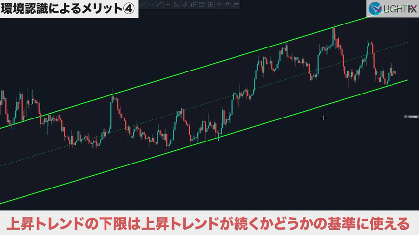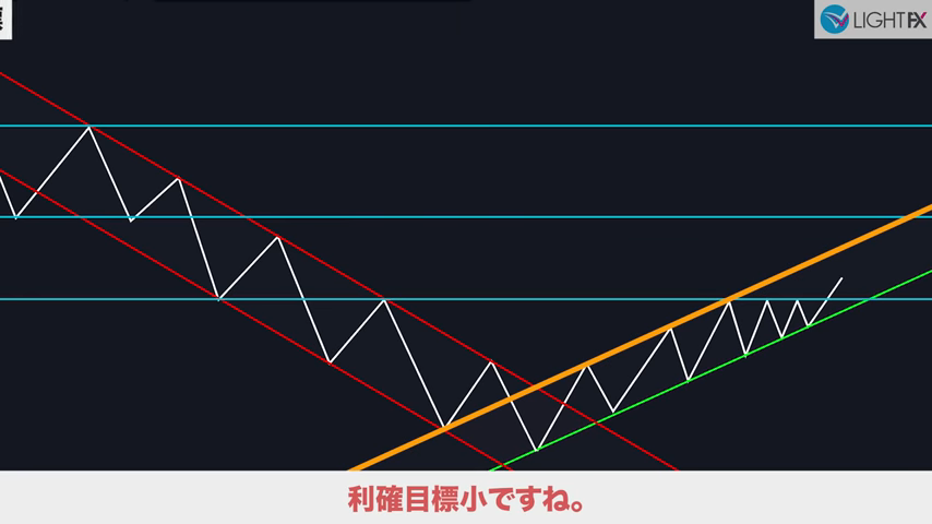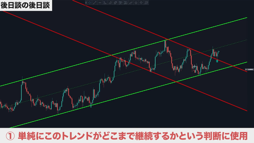 チャネル内で狙う利益幅が設定できるので、適切な戦略が組める。損切りも、ラインを抜ければ下降トレンド判断ができ、損切りラインも戦略的に組める。