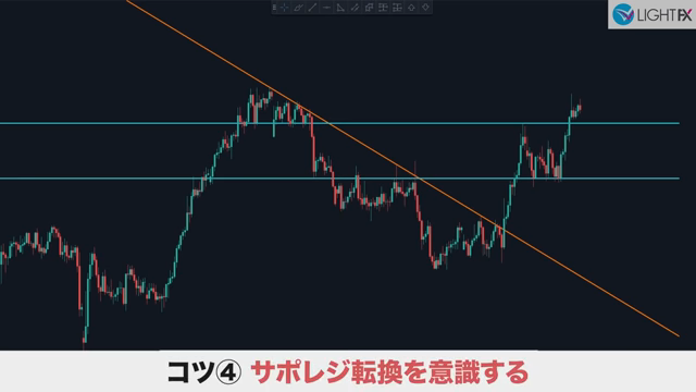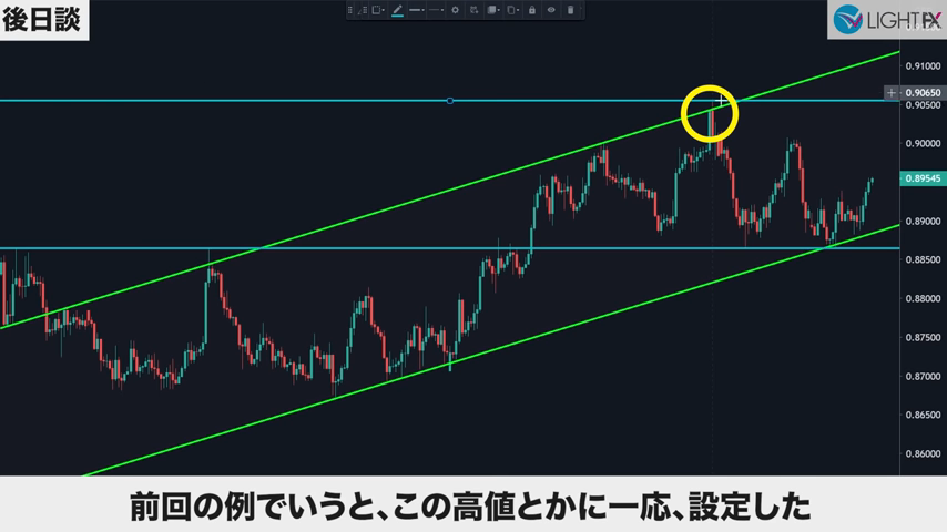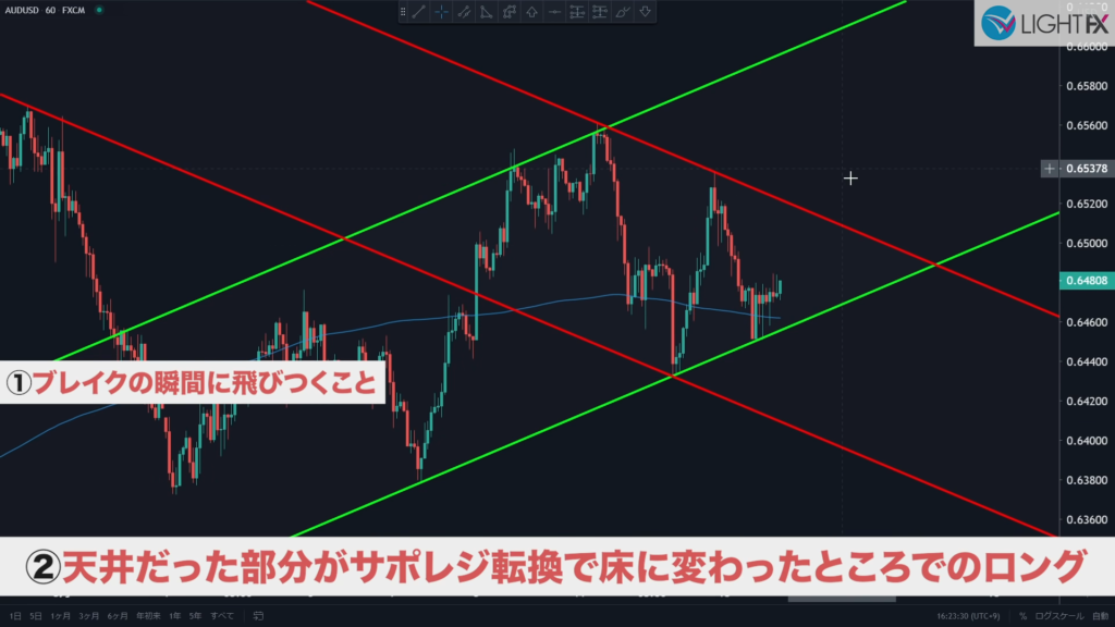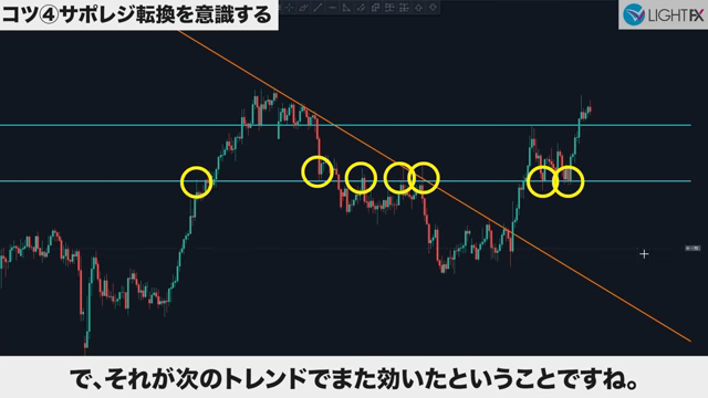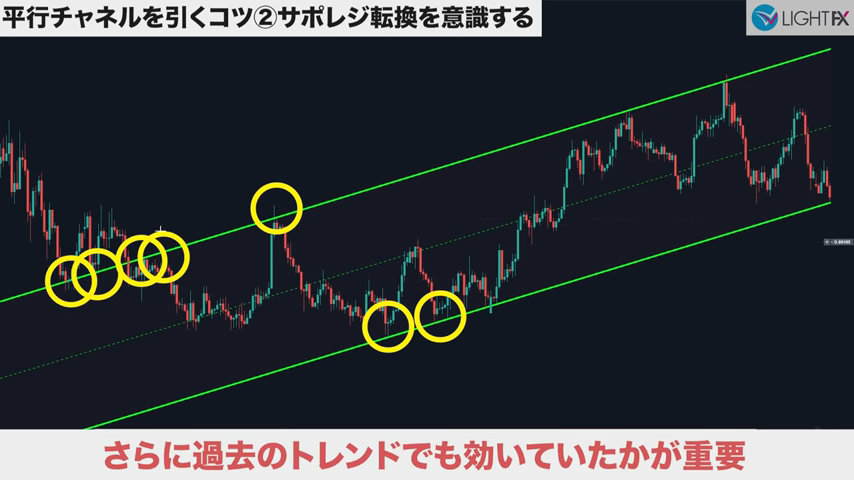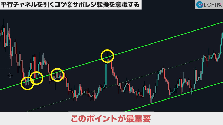 トレンドの切り替わり(新しい並行チャネルを作成)のタイミングで、サポレジを探す。