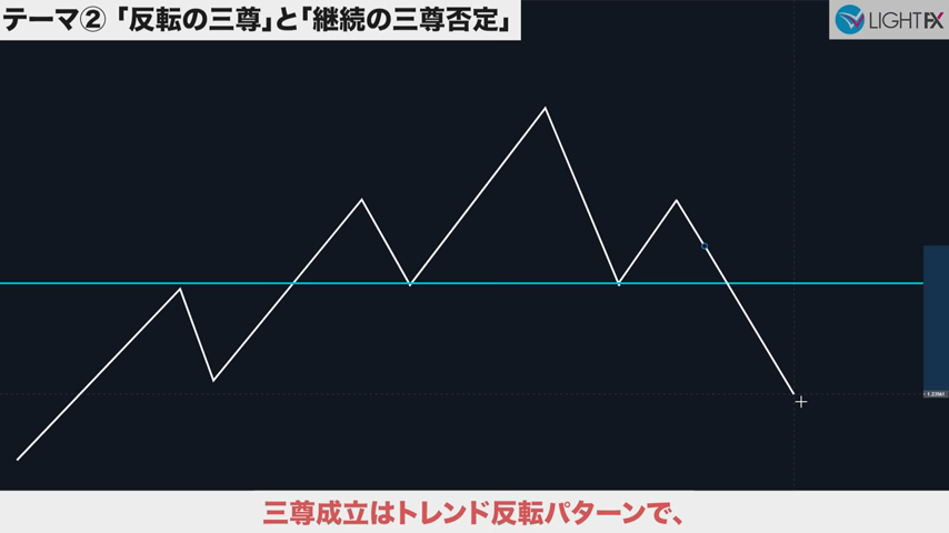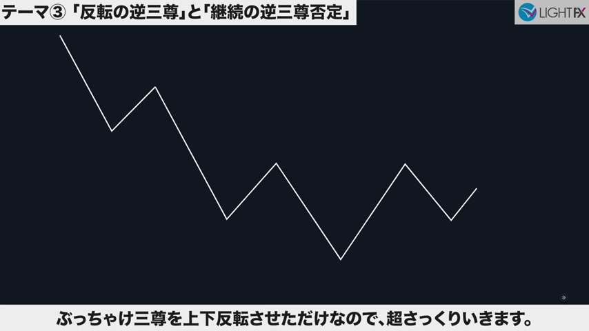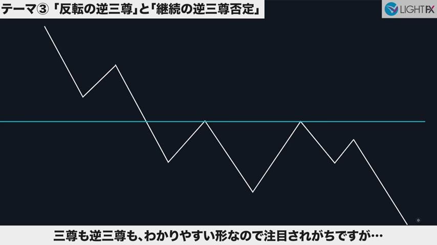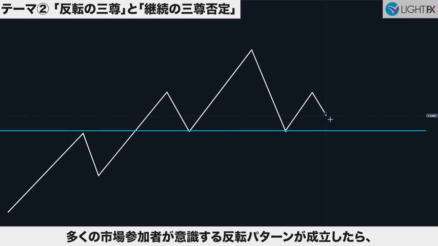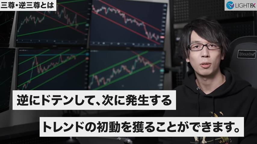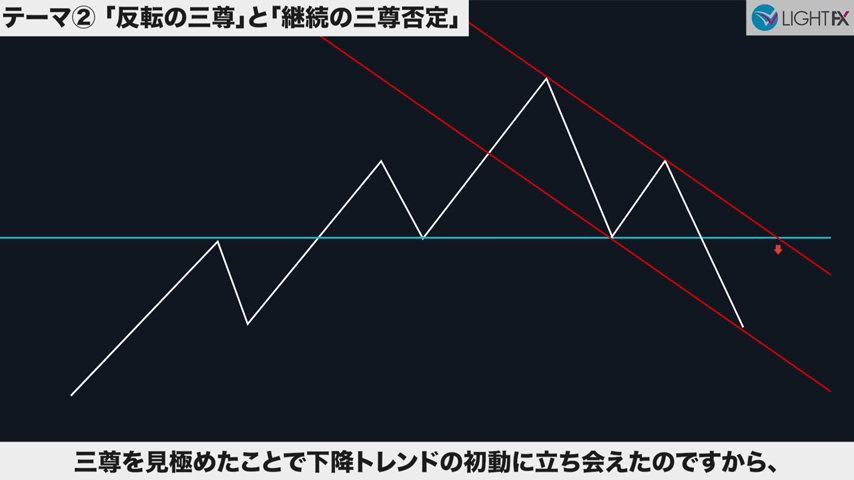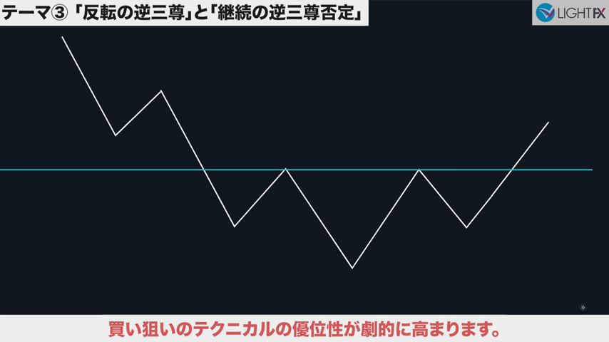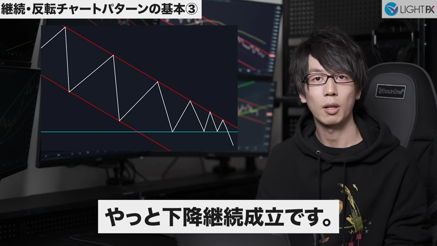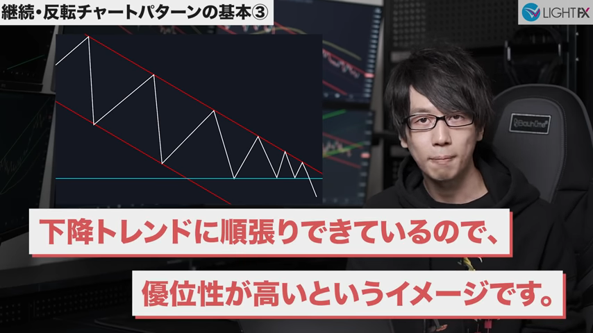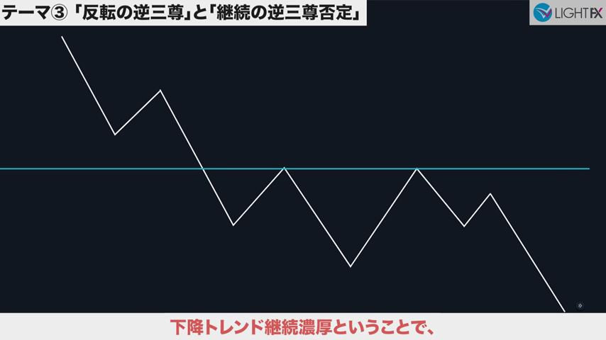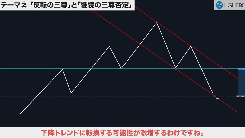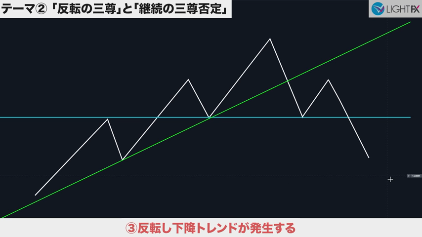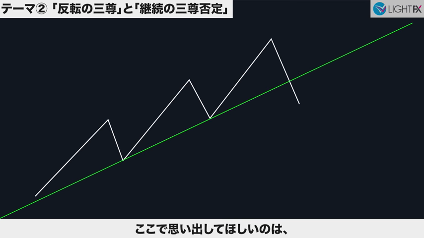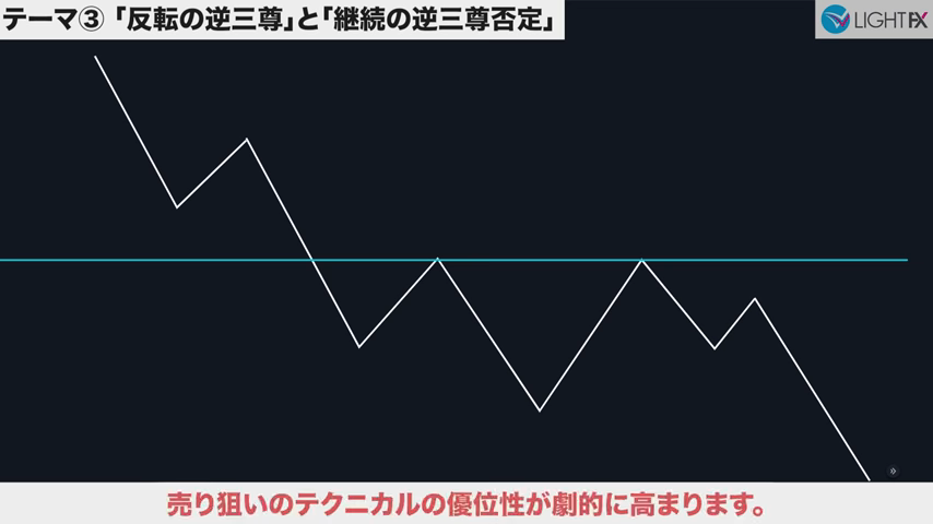 3本目のトレンドラインをブレイクしたら、トレンド転換、売りの優位性が激増する。下降トレンドへ。
