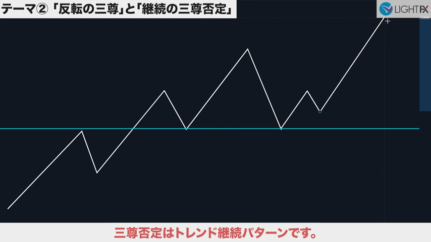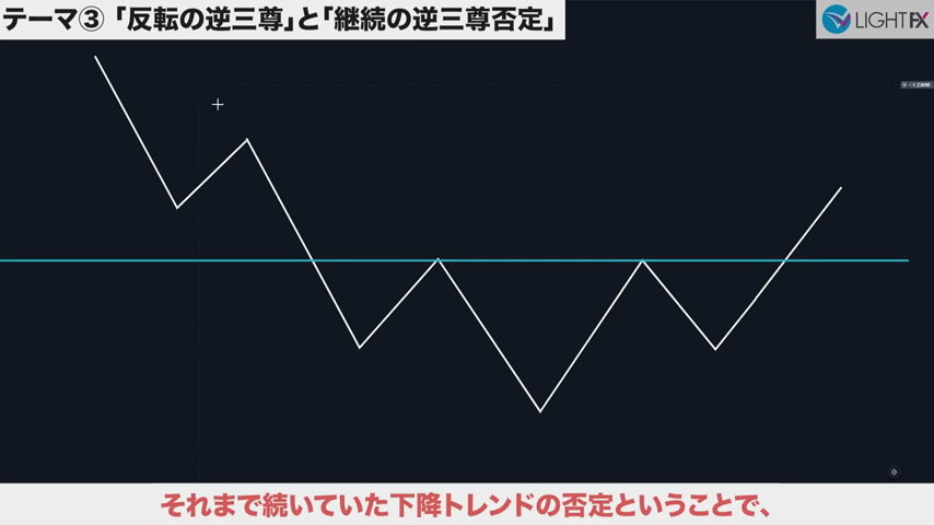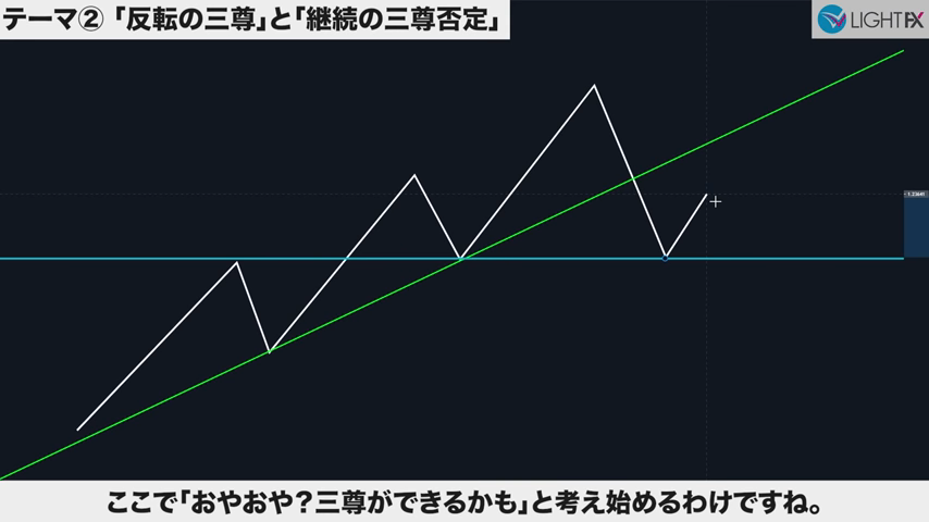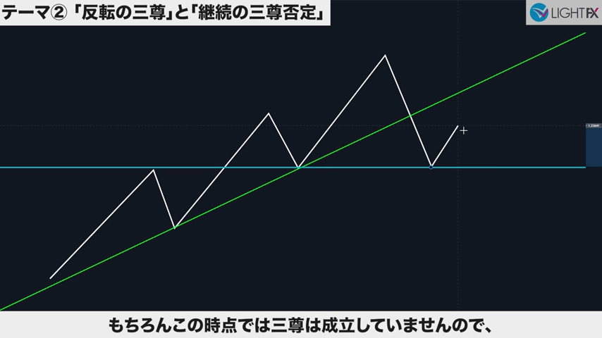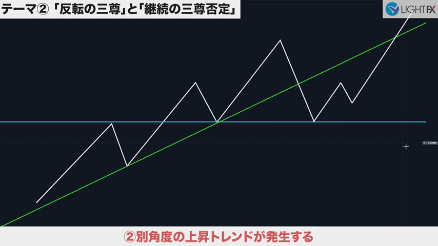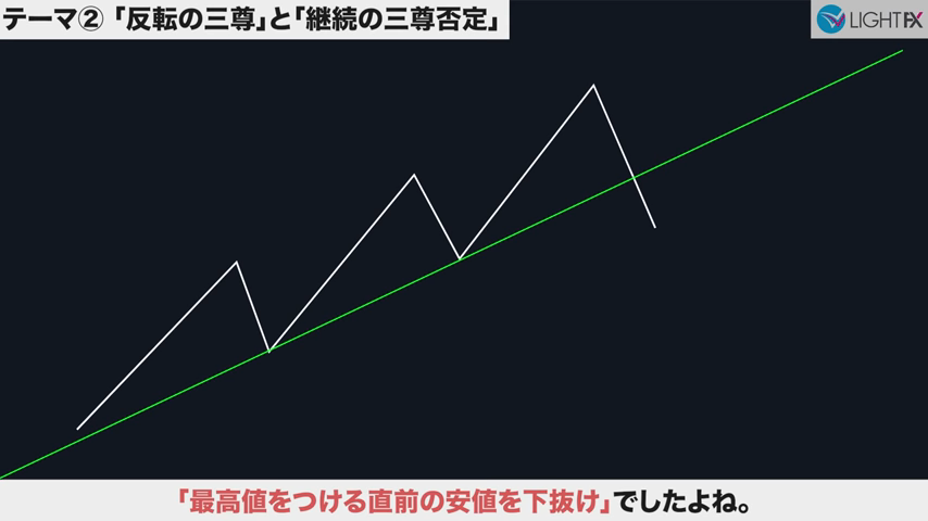 高値の直前にある安値で、トレンドラインを引き直す。トレンドライン3回目。