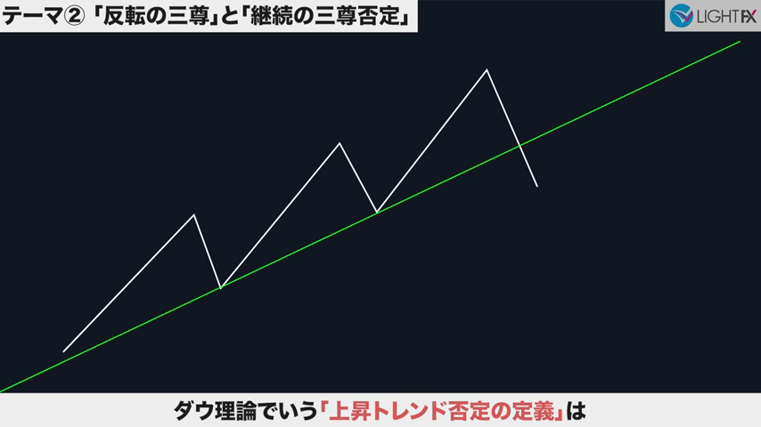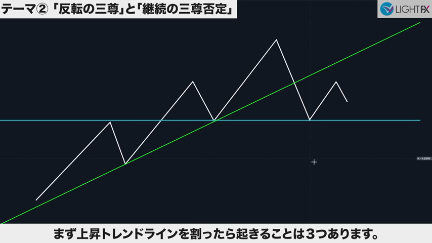 トレンドラインをブレイク後、安値を切り下げれば下降トレンド発生の可能性。レンジになる可能性もある。
