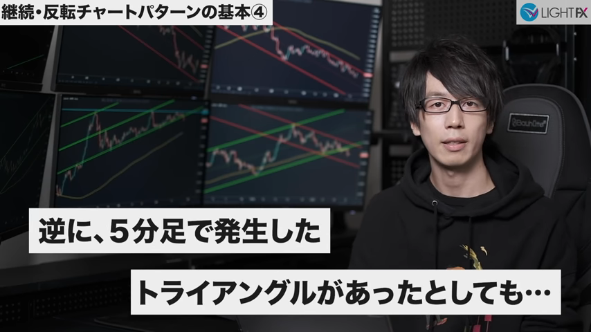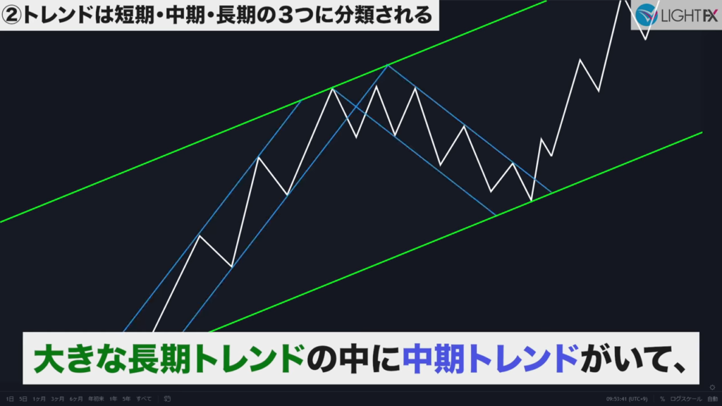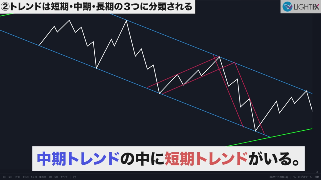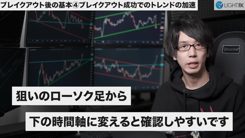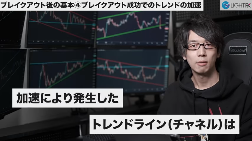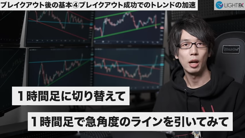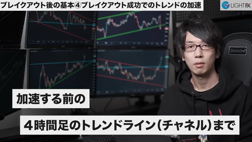 加速後のトレンドラインや並行チャネルは、下の時間軸に変えると確認しやすい。