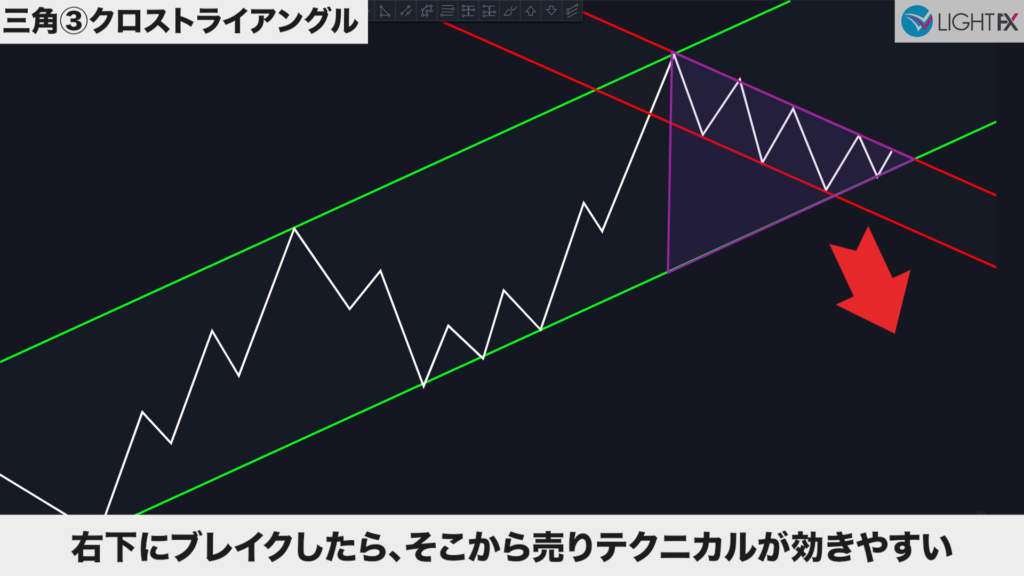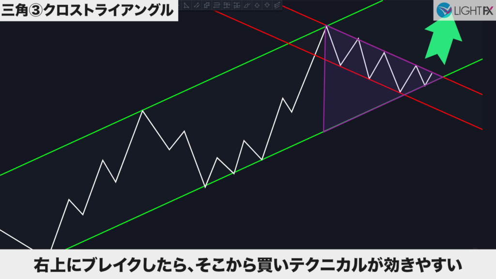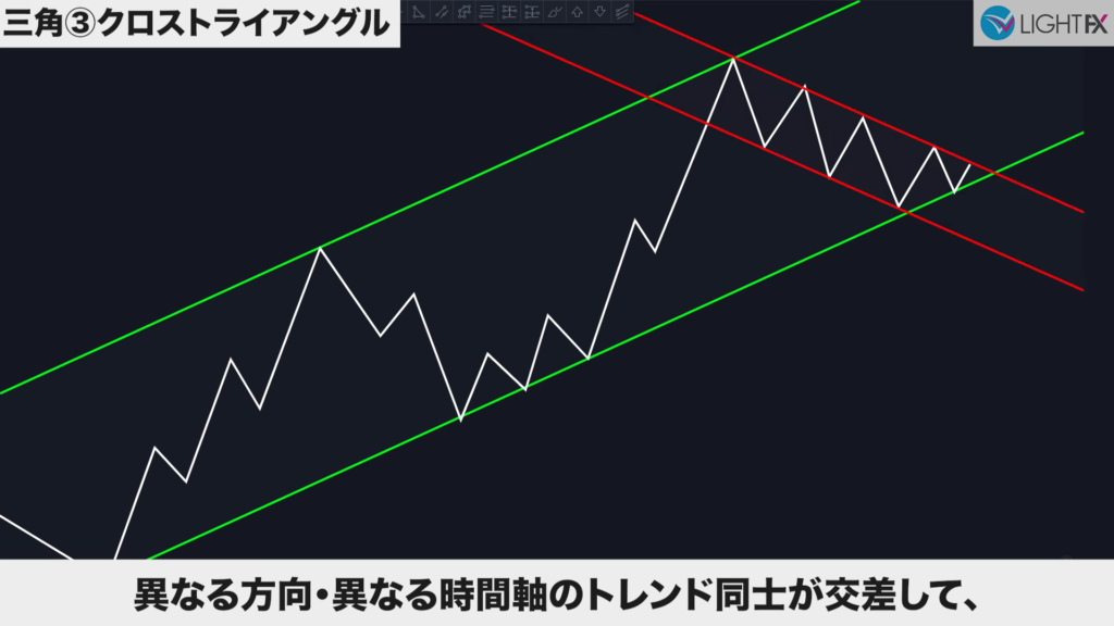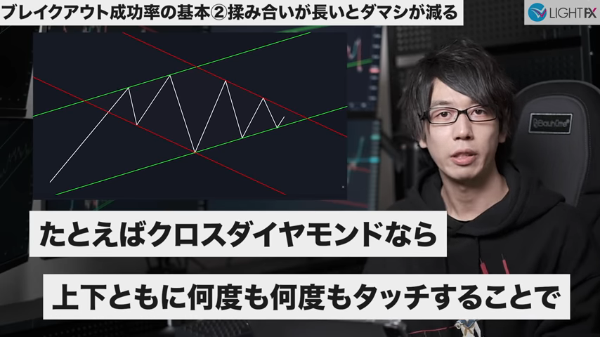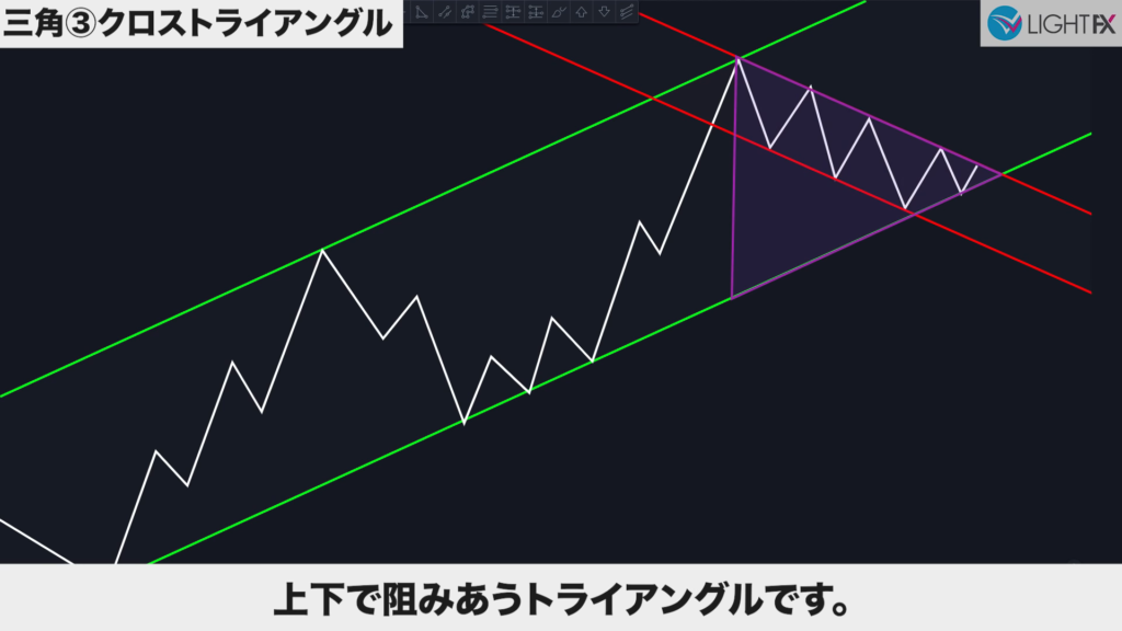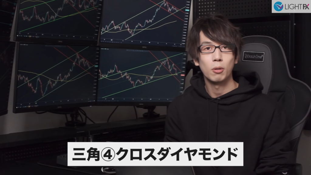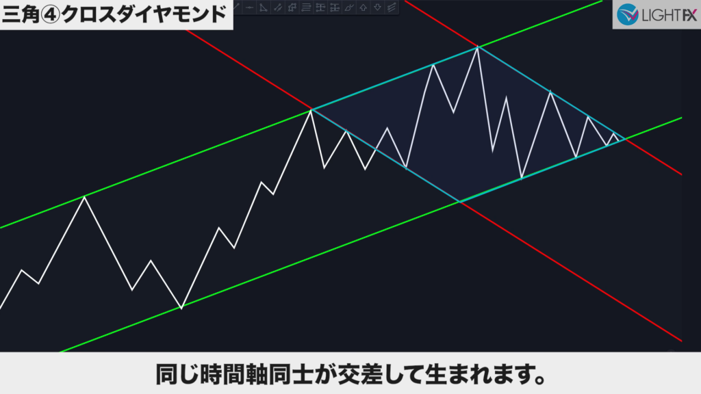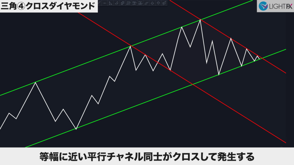 2つの並行チャネル(ハイ・ロー)がクロスしている時、ダイヤモンドの形をクロスダイヤモンドと言う。美しいひし形が理想(同じくらいの幅や角度が効きやすい)。