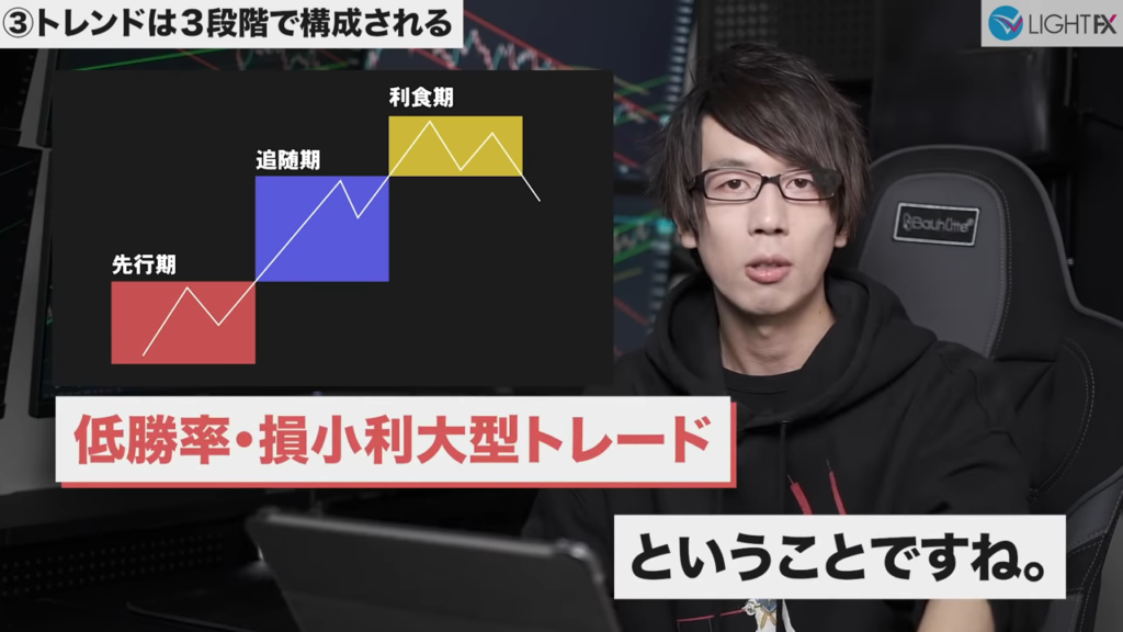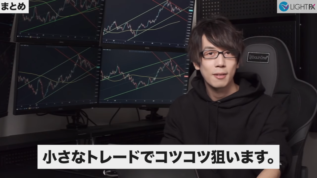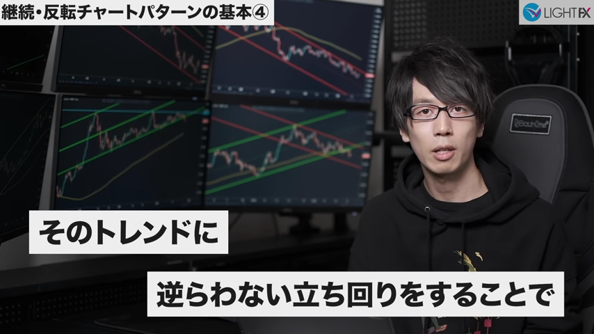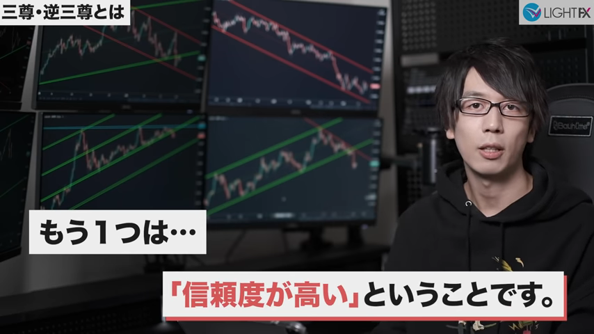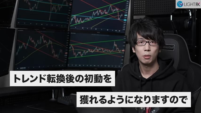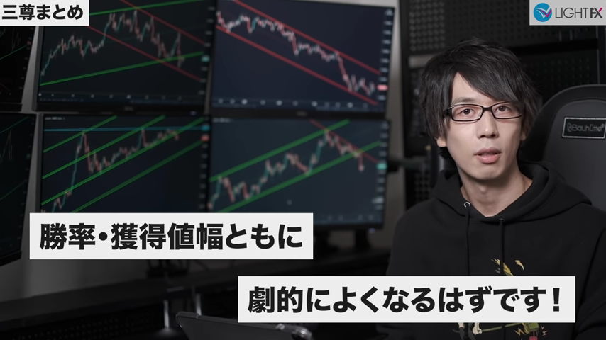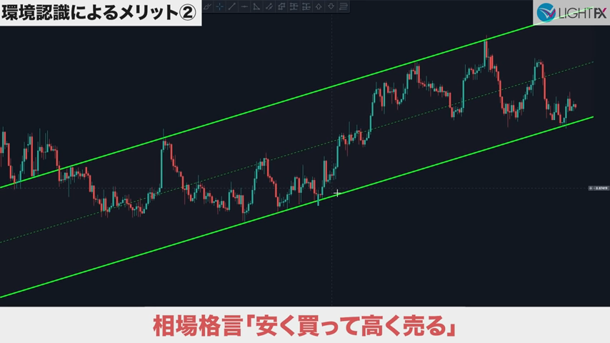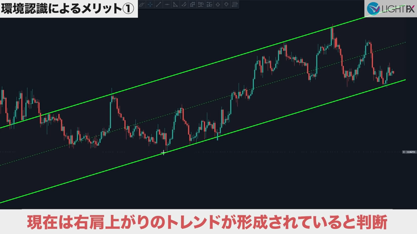 未来予想が不要で方向感がしっかり出てからエントリー出来る。待つことが出来るようになりラインまでひきつけるのでリスクリワードが良い。トレンドを把握できラインが崩れたら損切りと損切り判断が分かりやすい。