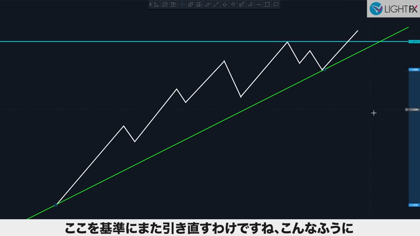 緩やかなトレンドラインを、引き直す事が可能。起点から、最高値をつけた直前の安値でトレンドラインを引く。