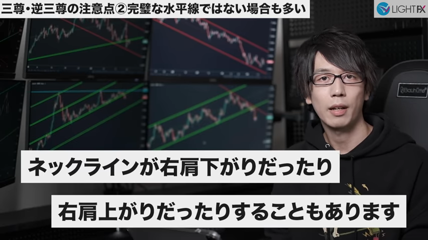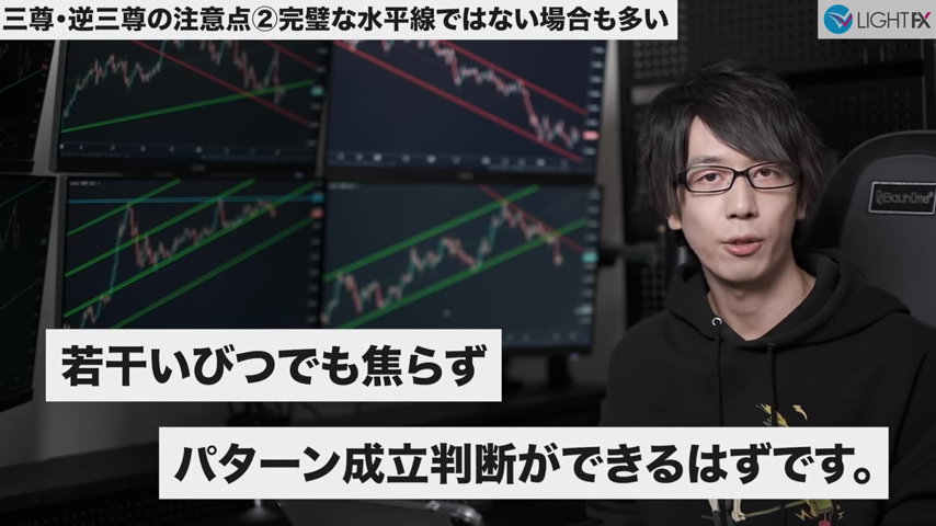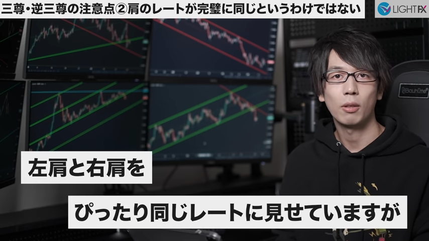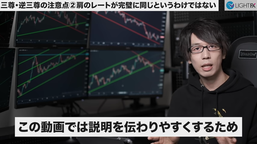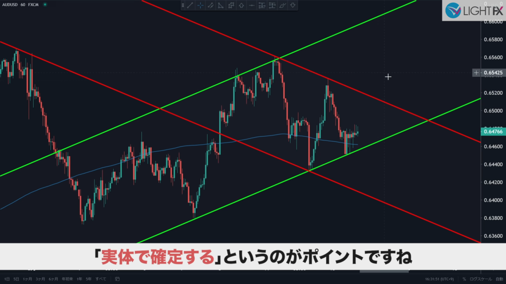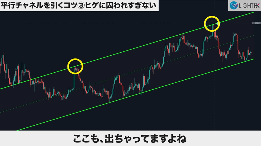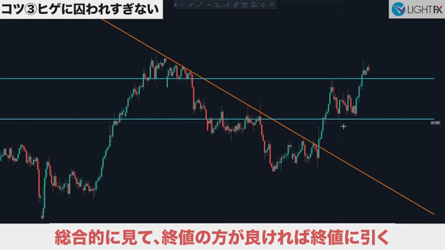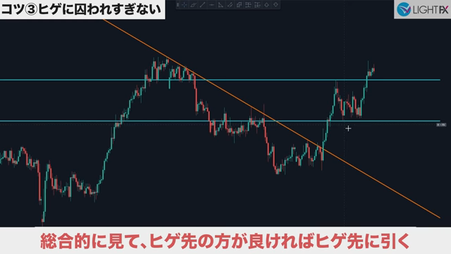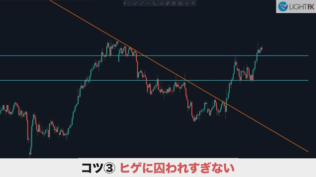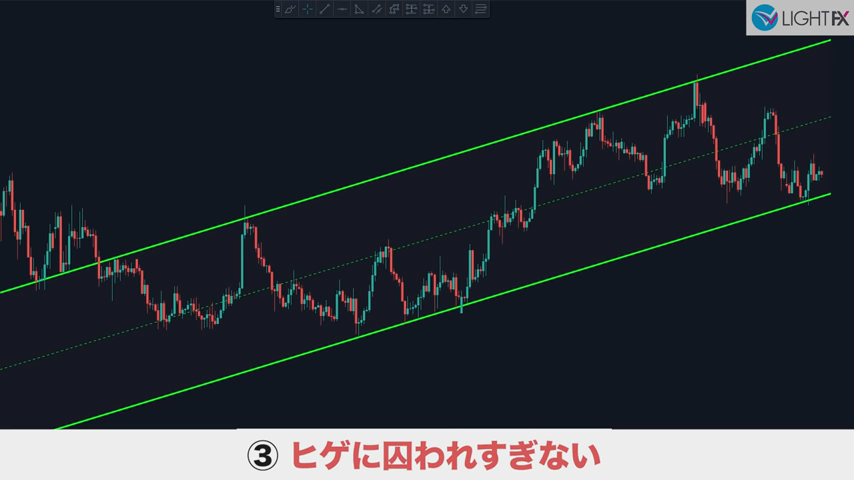 斜めのラインはトレーダーによって個性がでる箇所で、人によってはヒゲが絶対と言うこともあるが、あまり囚われなくて良い。
