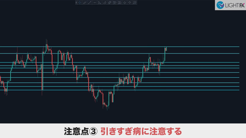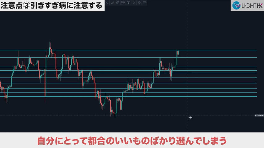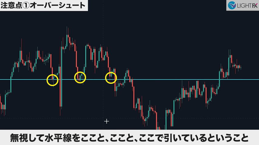多くの市場参加者が意識する箇所に反応するので、市場参加者が少ない「行き過ぎ」は、時に気にしないでラインを引く。