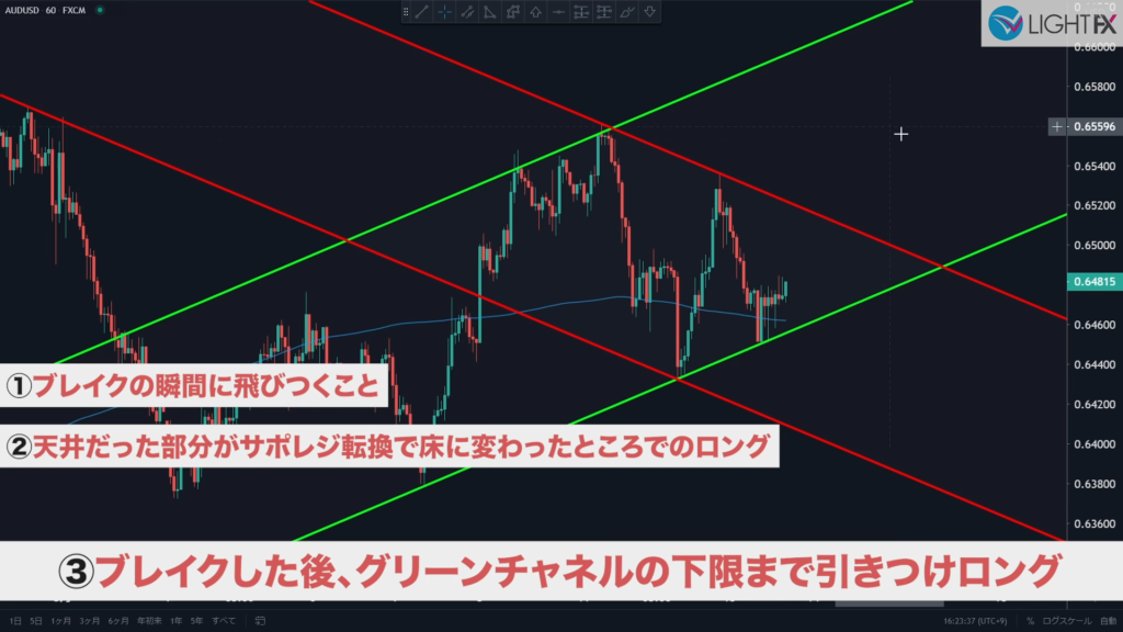 ③ブレイク後、グリーンチャンネルの下限でロング。
