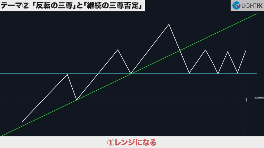 2回目のトレンドラインをブレイクしたら、1回目と同じ。レンジか下降トレンド、緩やかな上昇トレンドの3択。高値と安値に注意して判断する。