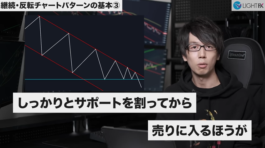 3本目のトレンドラインを割った後は、売りのテクニカルが効きやすくなる。