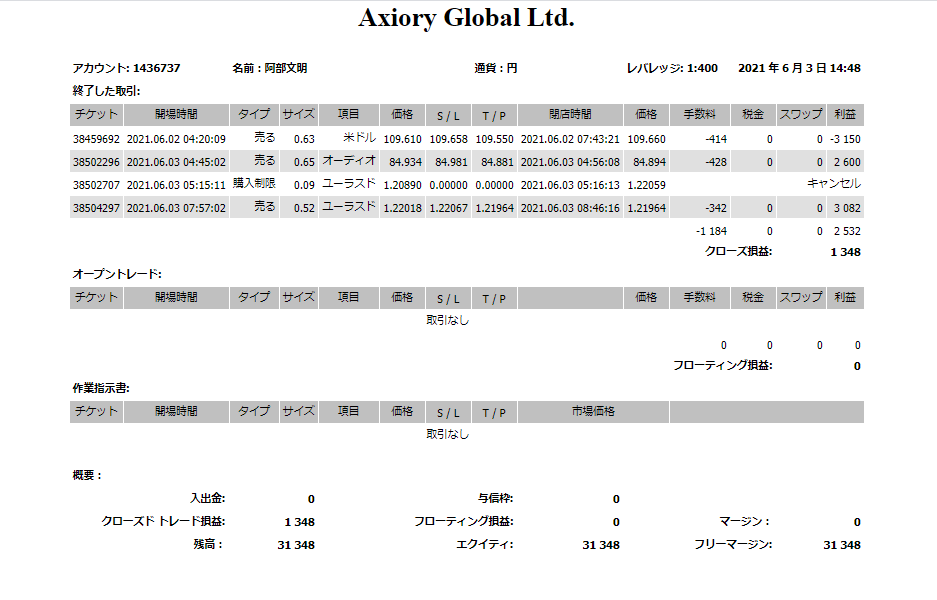 - 2021.06.03 EUR/USD 勝ち