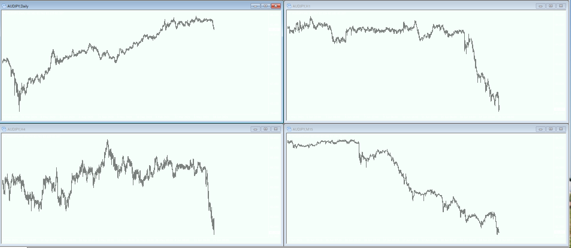 →下記画像のように、エントリーの6通貨とも各通貨ごとに、日足・4H・1H・15Mと1画面で表示させプリントし、空白に分析を記入してアラートセットまで考えておく