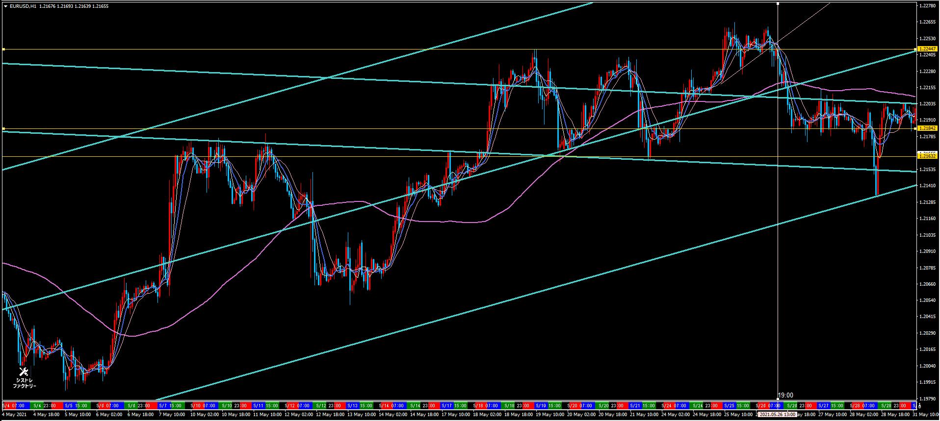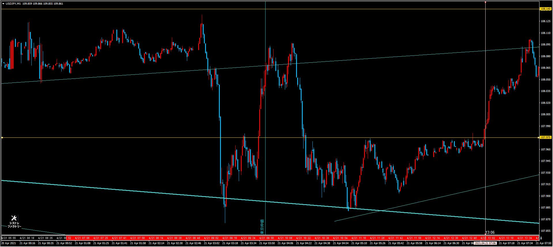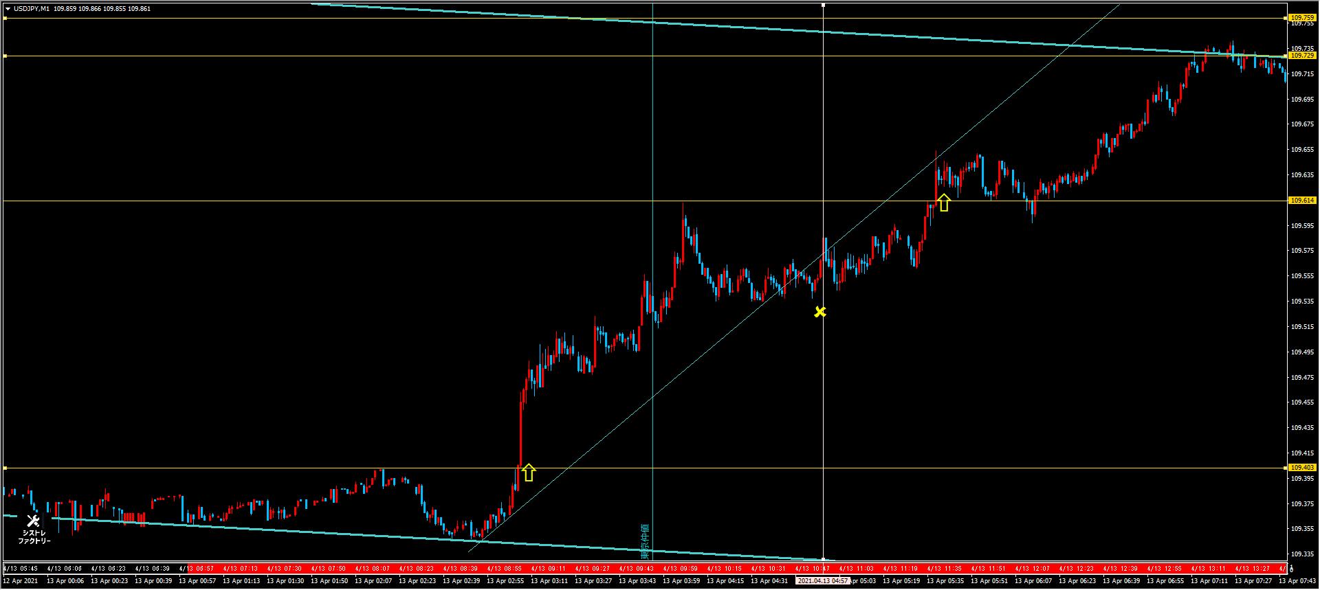 - 1時間のチャネルラインの上限~中間まで→中間ではレンジに注意