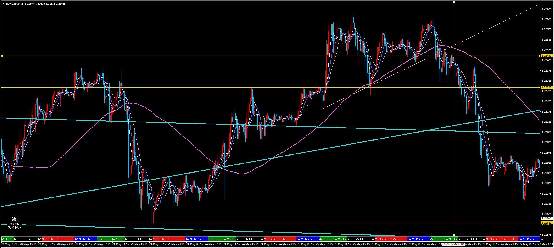 - エントリーラインに指値(スプレッド分下がってエントリーされる)・3~5pips下に損切・エントリーラインから1.2倍の位置に利確ラインを引く